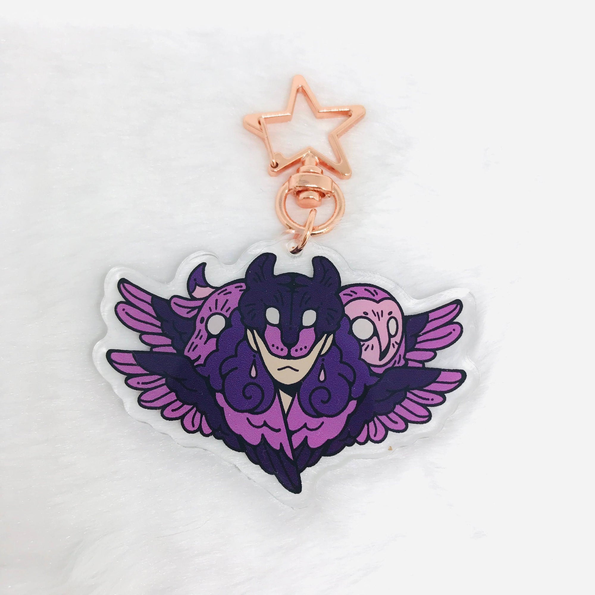 A many-faced cherub in purple, for Queer pride.This acrylic keychain is 2.5 inches (6.3 cm) long, double-sided with the same print on both sides. The keychain has a rose gold star-shaped clasp.Please note: the keychain comes with protective film that should be peeled off.