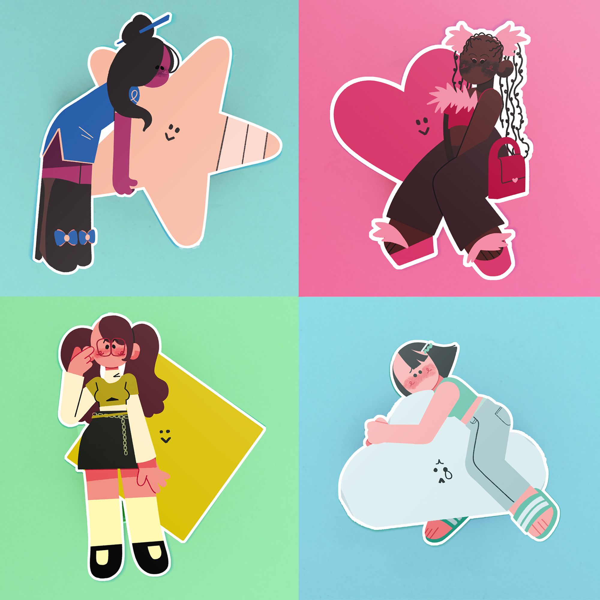 All the Shapes and Shape Girls all together. Would u really want to break them up? This pack contains 1 Shape Girl Star Sticker, 1 Shape Girl Cloud Sticker, 1 Shape Girl Heart Sticker, and 1 Shape Girl Square Sticker. Original art by Shadeyart.