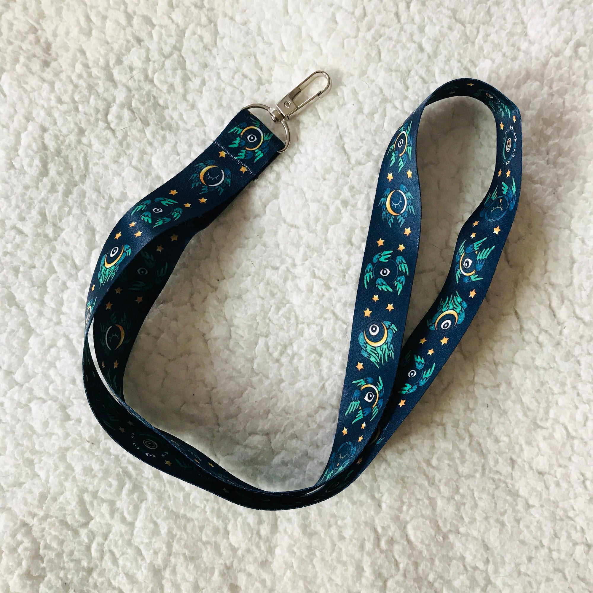 A lanyard featuring a whole flock of ophanim to guard your keys or cards! The lanyard is approximately 1 inch (2.5 cm) wide, 19 inches (48 cm) long. It has a metal lobster clasp.