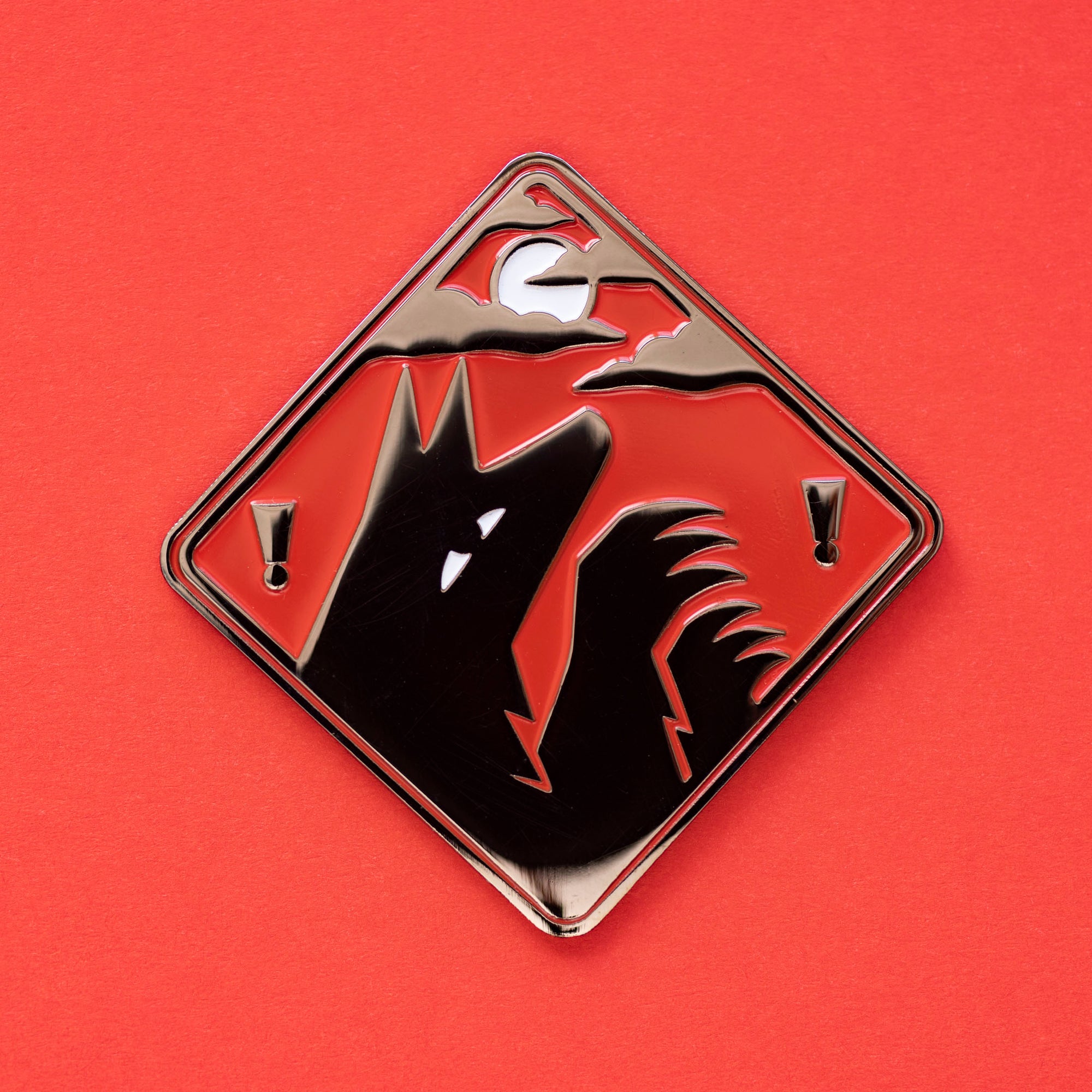 Look out for werewolves! This soft enamel pin is made of black nickel enamel, and has two sturdy rubber backings.